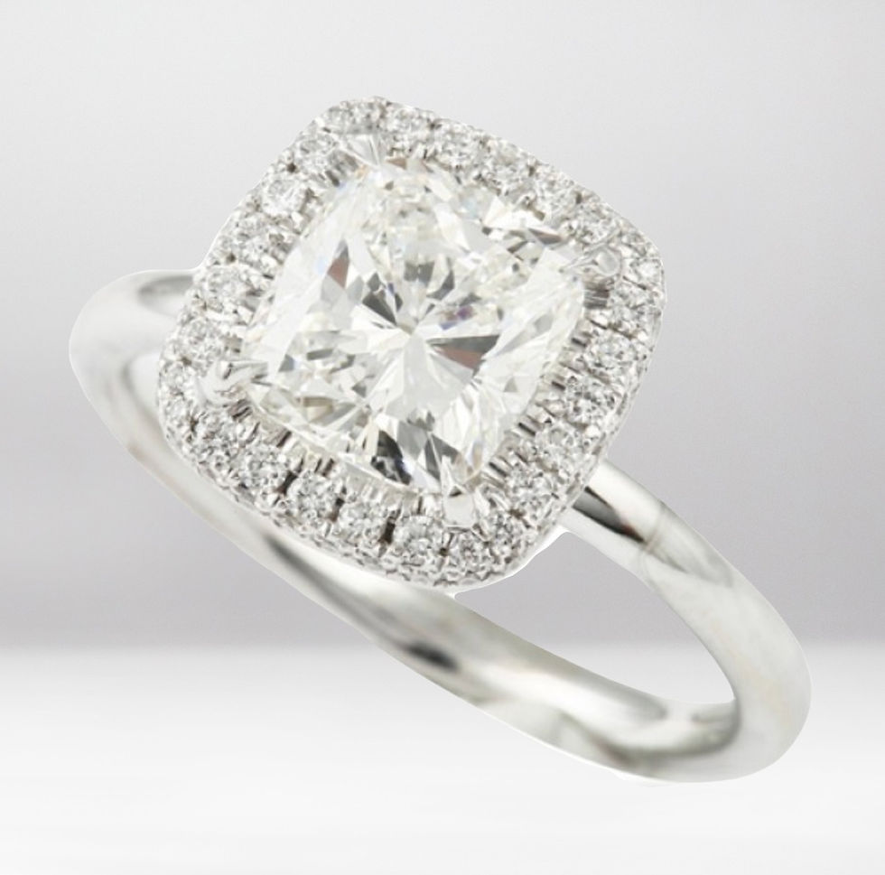 True to its name, a cushion cut combines a square cut with rounded corners that resemble a pillow. The cushion cut is comprised of 58 facets, all of which disperse light, resulting in a brilliant and dynamic appearance.